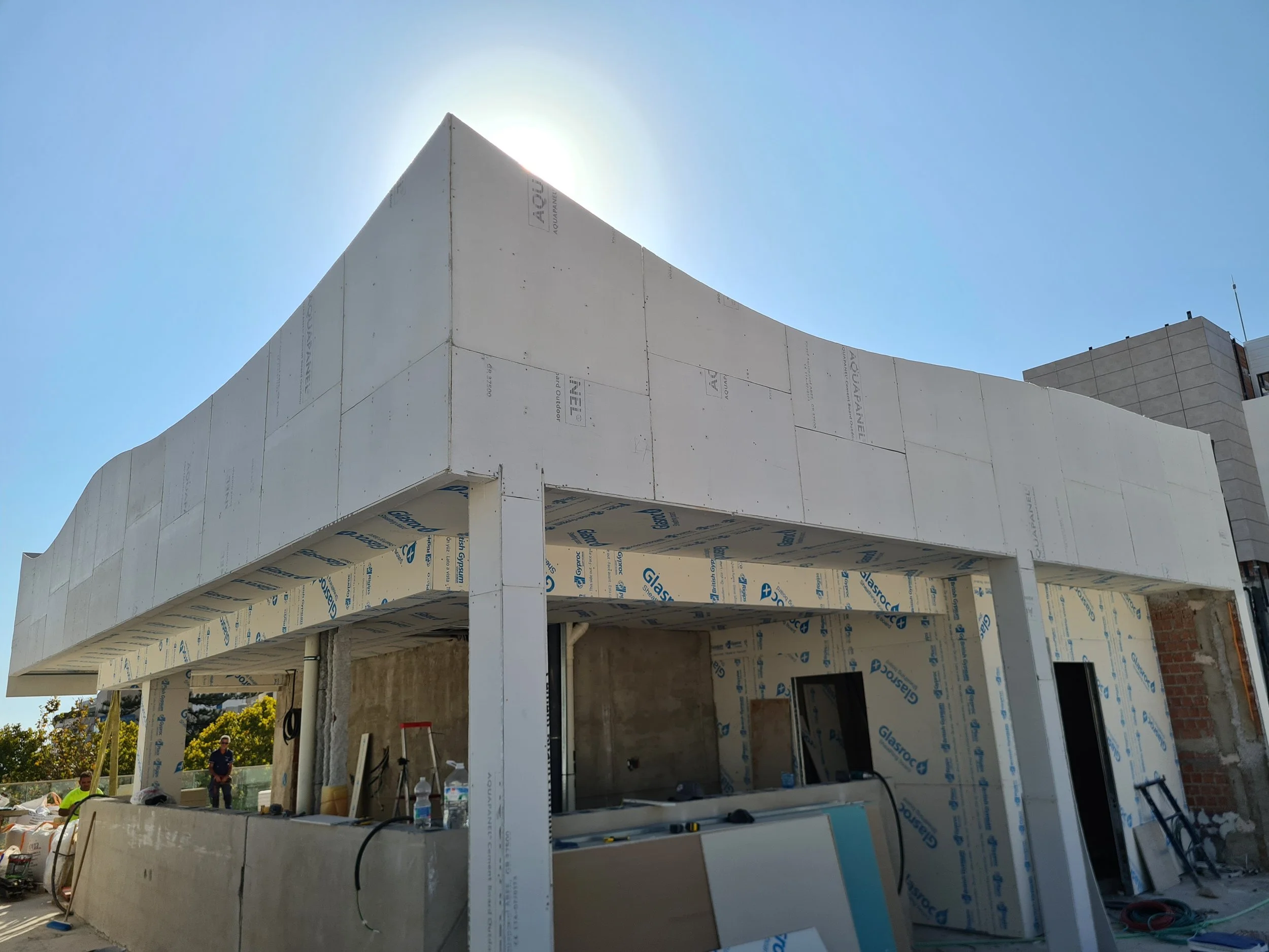 Remodelação completa em unidade hoteleira na cidade de Marbella, com execução de divisórias interiores, tetos falsos e tetos exteriores. Destaque para a construção de um teto redondo no saguão principal, exigindo elevada precisão técnica e acabamento estético. A intervenção incluiu ainda a aplicação de sistema de fachada com painéis cimentícios tipo Aquapanel, garantindo durabilidade, resistência à humidade e um excelente desempenho térmico e acústico.